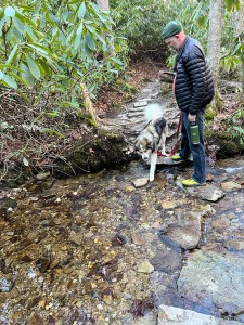 We went hiking over 6 miles up along the Blue Ridge Parkway near Julian Price Lake. We did the Boone Fork Trail. Ghoster, as we sometimes call him now, was a natural. He forded water, scrambled rocks and even let Marty and I help him down a ladder. For anyone reading who might be wondering about Shadow– Shadow is 10 1/2 years old now. Malamutes have a life span from 10-12 years and while Shadow is very healthy, he would not have made it on this hike. Tis past spring, we brought him on an easy trail he’s done a lot in his 5 years with me and Marty had to go get the car to rescue him. He’s slowing down and not able to go as far as he used to. He’s not in pain. He gets up a little more slowly, but overall is in good health. He just can’t do the things he used to do. Not to mention, he’s a Malamute and not a Husky– huskies are a little more agile due to their smaller size.