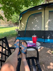 In an attempt to find a nice place outside- I set up a very large 17 year old tent to try out as an office. My back deck and front porch are nice, but the sun makes it hard to see a computer screen. I have an umbrella on one of my tables, but the struggle is always real. Working from the front porch swing just doesn’t work. I was going to buy another canopy, but figured I could save money by putting up the tent in the backyard. It is so big, that Marty and I will never use it, so what the heck, right?