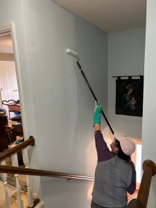 We had already painted the stairs, of course. Since I didn’t feel comfortable standing on a drop cloth on the stairs, I’ll be slapping some paint on the stairs again…….