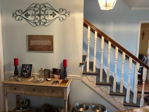I am glad I painted the halls, because there were a lot of mistakes that I noticed almost daily for 5 plus years. Other people probably did not notice—–ever. Marty had fixed the banister posts and I got those painted yesterday, too. With rescue cats…..they have been rough on those posts! This hole repair was my best repair EVER– as in, I know where it was and even I have a very hard time finding it. I am learning! Yes!