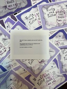 I made save the date cards complete with a note on the back making sure everyone knows we are not going to have a registry and we do NOT want any gifts. We already have too much stuff and really just want people to come celebrate our joy with us. We are truly happy and very excited about this next step. I’m over the moon, for sure. Still can’t believe it. I had fun making the cards and have almost designed the invitations. I had all I needed to make the save the date cards, but ordered a stamp set to make the invitations.