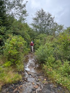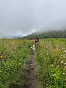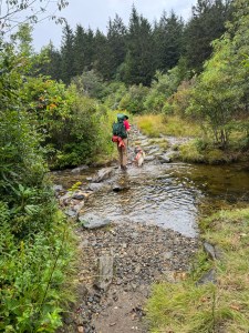 The first day of the hike, we had a few water crossings and saw three waterfalls. The second day, we called it the “no dry feet trail”. There were multiple waterfalls on streams we had to cross. Ghost gave the trail two wet paws high up! He LOVES water. There are several miles of the trail that are a literal creek that you walk right through. We wear wool socks, so even though the day started out at 56º, our wet feet stayed warm and toasty. We hiked a total of 6 miles on day two.